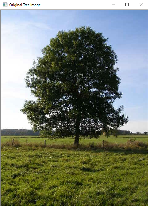 Next, we must load the image in. If the image is in the current working directory that you are using, then you simply just have to specify the file name. If it isn't, then you have to specify the full path on your computer to the image. In the example, the image is in the same folder as the current working directory, so we simply specify the file name, 'Green-tree.jpg'.